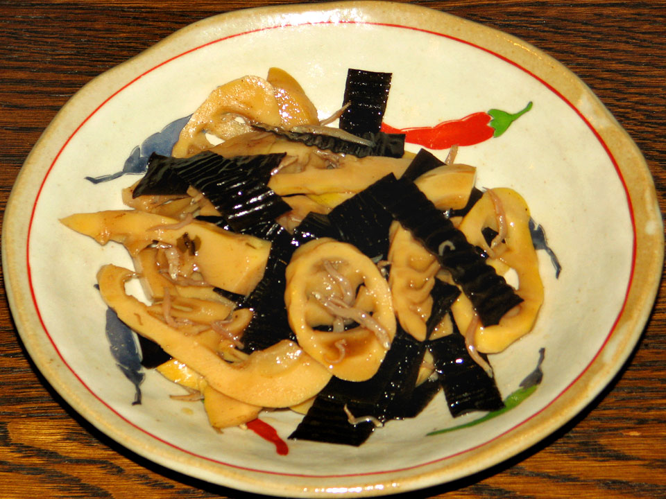 写真は春メニュー「たけのこ と あらめの煮付」。大450円 小400円。