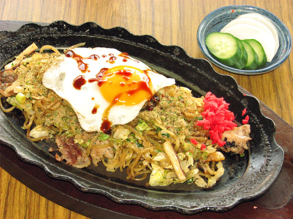 | いかそば、肉そば、玉子そば、塩やきそば、そばめしがございます。良質のラードを使用、飾らない美味しさで地元の方にも愛されてます。ボリューム満点。長年使用した大きな鉄板焼で焼きます。 |