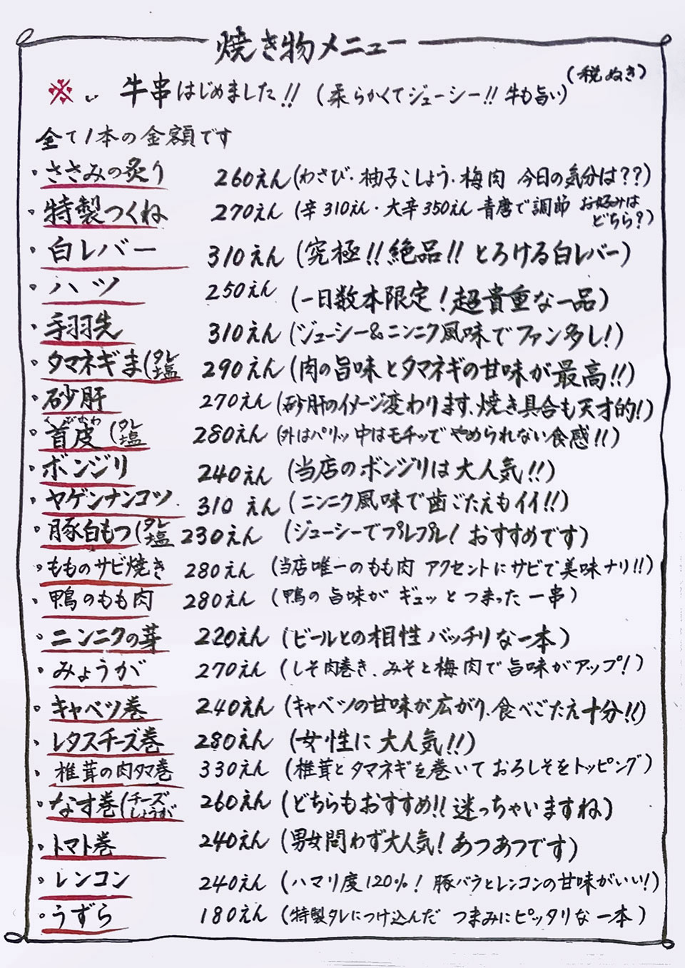 | 焼鳥専門店 種類も豊富。 |