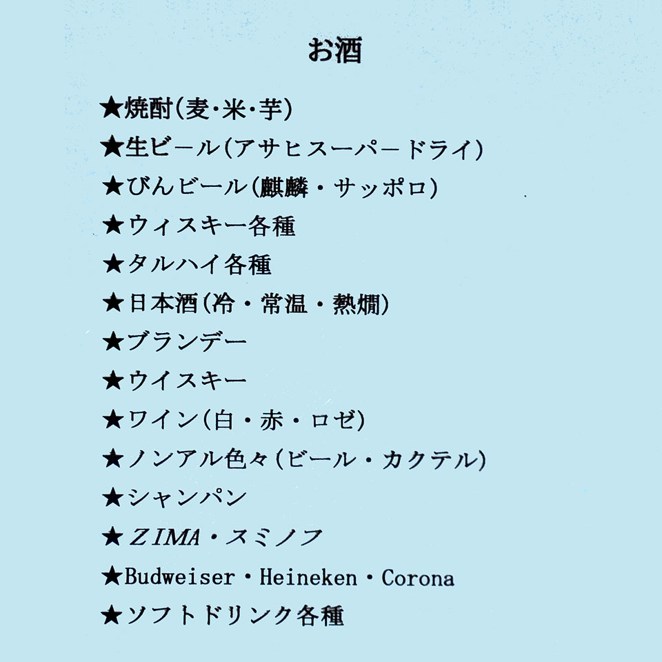 | ドリンクの種類豊富です。オリオンビールや泡盛も。 |